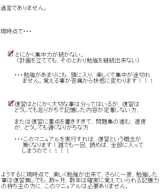 しかし、この「記憶術、速読術」を使う事で、過去問題集(新スーパー過去問ゼミ)を一冊を 覚えるのに3ヶ月掛かってた私が3日で一冊覚えられるようになりました。